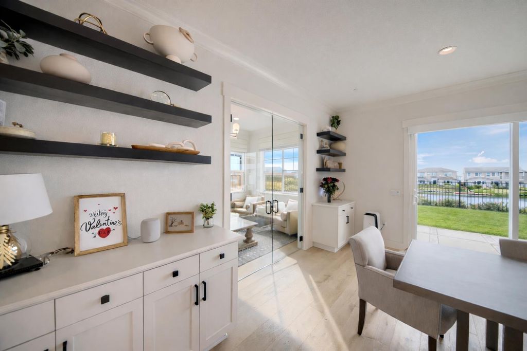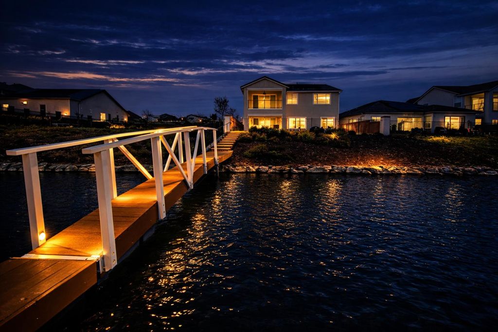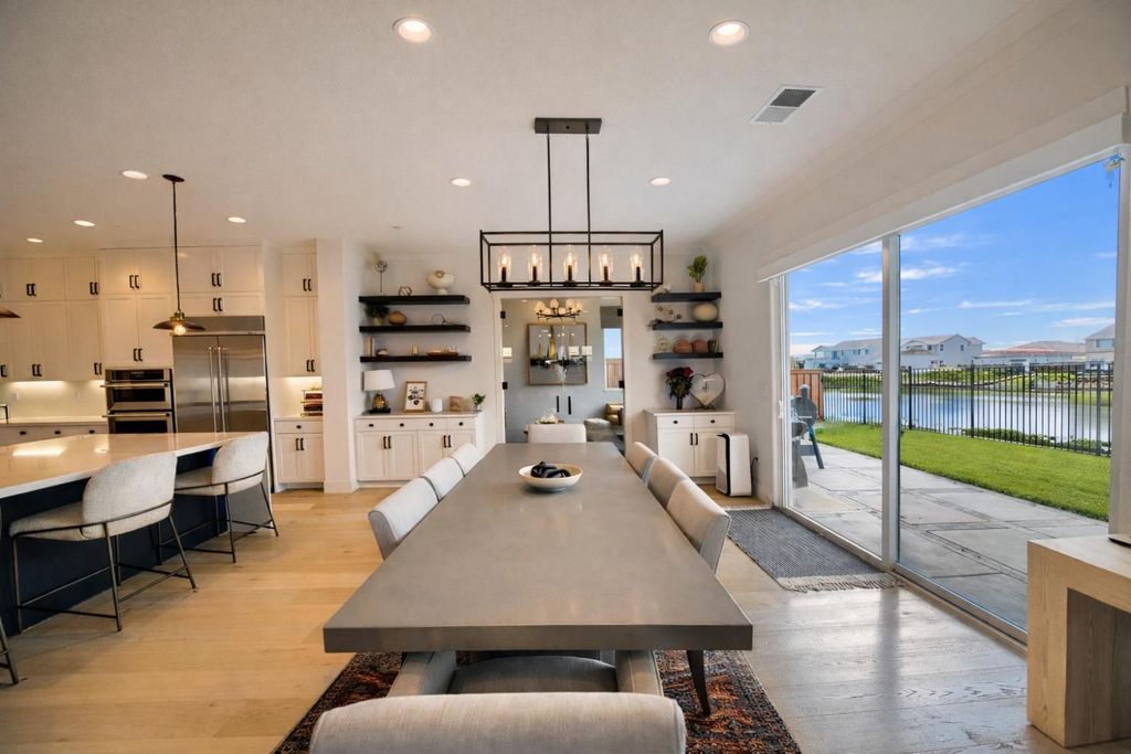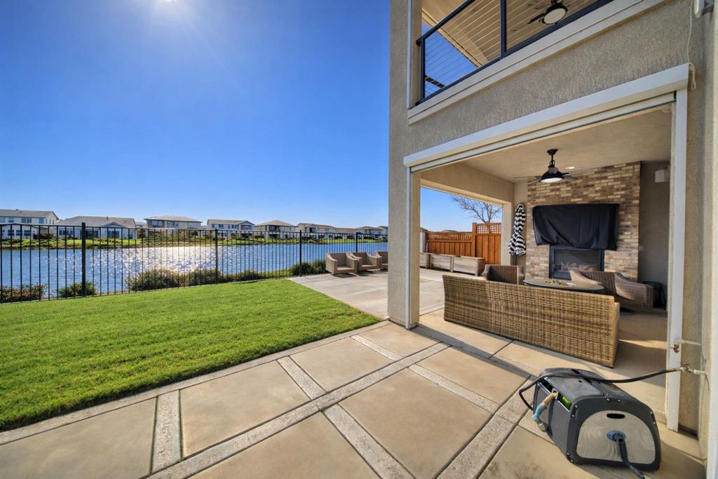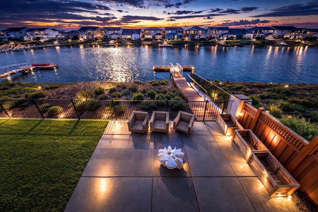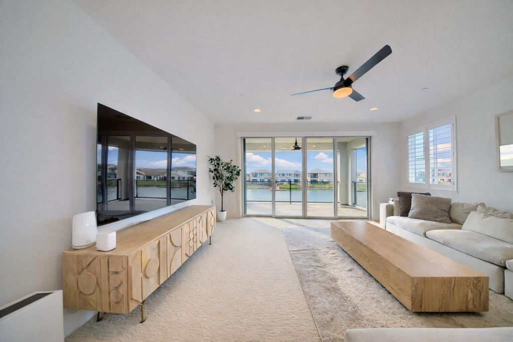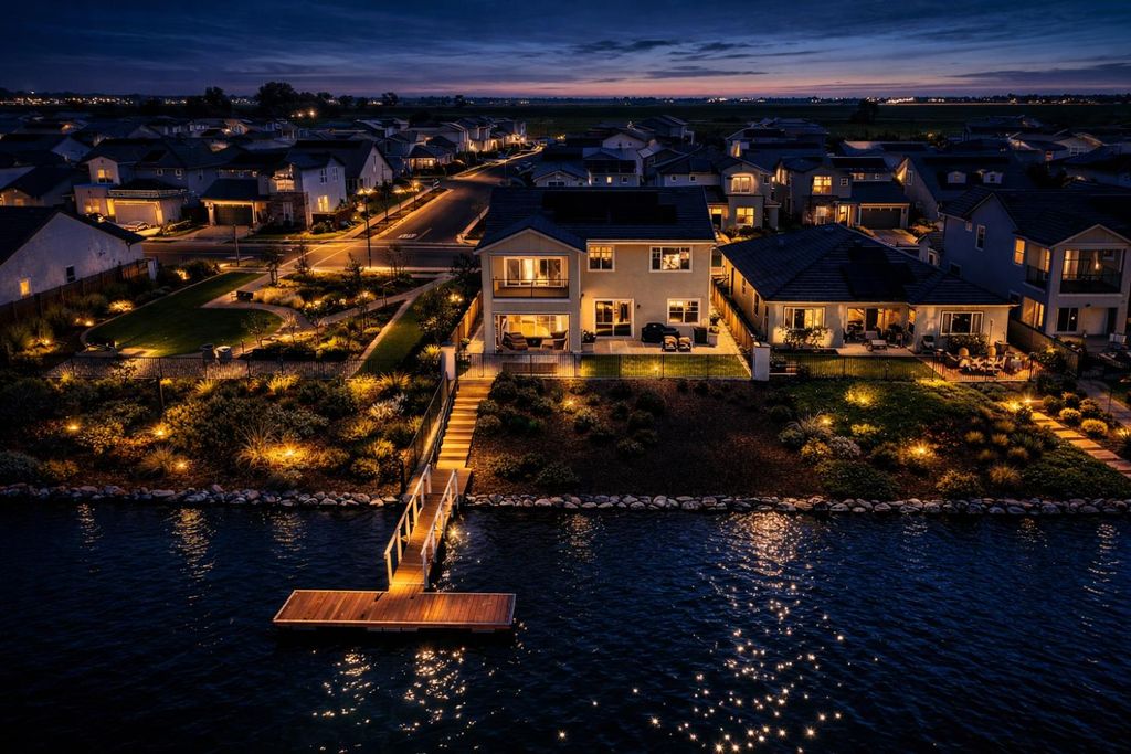 2150 Mulholland Dr is a rare north-facing lakefront opportunity positioned on one of the most desirable lots in River Islands with no side neighbor to the east and only a single-story to the west, creating exceptional privacy and panoramic water views. The property includes its own private boat dock that is not shared, a feature rarely available in this community. Real natural hardwood floors span the entire downstairs, leading into a statement kitchen anchored by a waterfall island with abundant seating, ceiling-height cabinetry, soft-close cabinets and drawers, commercial-grade stainless steel appliances, and a built-in refrigerator. An extended butler's area provides additional cabinetry, coffee bar space, and storage, complemented by a spacious walk-in pantry. Massive sliding glass doors stretch across the entire back of the home in both the dining and family rooms, framing unobstructed lake views and creating seamless indoor-outdoor living. One dramatic floor-to-ceiling glass room captures sweeping water views, while a second glass-enclosed room offers a refined library-style retreat with timeless character. The California Room extends the living space outdoors with automatic smart blinds, surround sound, and a fireplace with blower, all overlooking a fully landscaped backyard designed for year-round enjoyment. A downstairs bedroom with connected full bath offers flexibility, along with a separate hall half bath. Downstairs bathrooms feature tile flooring and quartz countertops that match the kitchen surfaces, and all secondary bathrooms include upgraded tile finishes. Upstairs offers upgraded carpet with premium pad, a massive loft, and sliding doors leading to a deck capturing lake views from multiple angles. The primary suite is positioned to maximize water views and flows into a spa-inspired bath featuring quartz countertops, split vanities, soaking tub, rain walk-in shower, elegant tile flooring, and a walk-in closet. The laundry room includes a sink, cabinetry, and upgraded tile flooring. Additional highlights include a 3-car tandem garage, upgraded staircase, dual-zone HVAC, ceiling fans, upgraded lighting throughout, surround sound inside and out, and owned solar with added panels. A statement property defined by rare lot positioning, architectural presence, and true lakefront living.